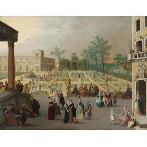 A PALACE GARDEN WITH ELEGANT COUPLES DANCING