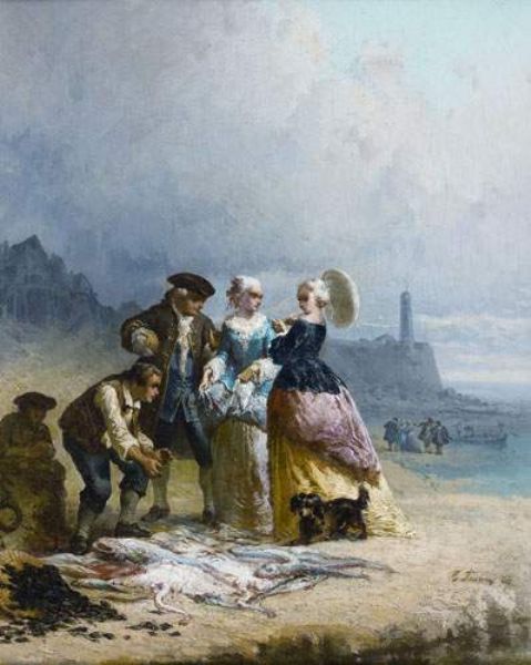 | Pêcheur montrant son poisson à un Seigneur et deux dames sur la plage | |