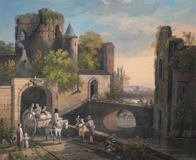 | Vue animée d'une entrée de ville fortifiée près d'une rivière. | |