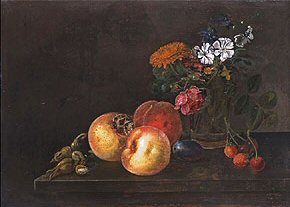 STILLEBEN MIT GRANATAPFEL, PFIRSICHEGLASBECHER N, NÜSSEN, ERDBEEREN UND BLUMEN IN EINEM