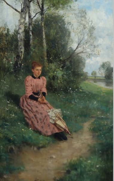 | Young woman in a pink dress, sitting with parasol near a lake | |