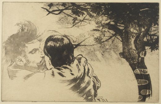 | Etching Soft-ground etching and aquatint in bistre on cream Japan paper | |