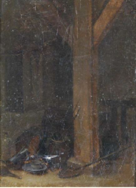 | A terracotta urn, a copper basin, a spade, a tea cup, ceramic plates and a water jug, set in a barn interior | |
