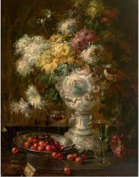 Stilleben mit buntem Chrysanthemenstrauß und Kirschenschale