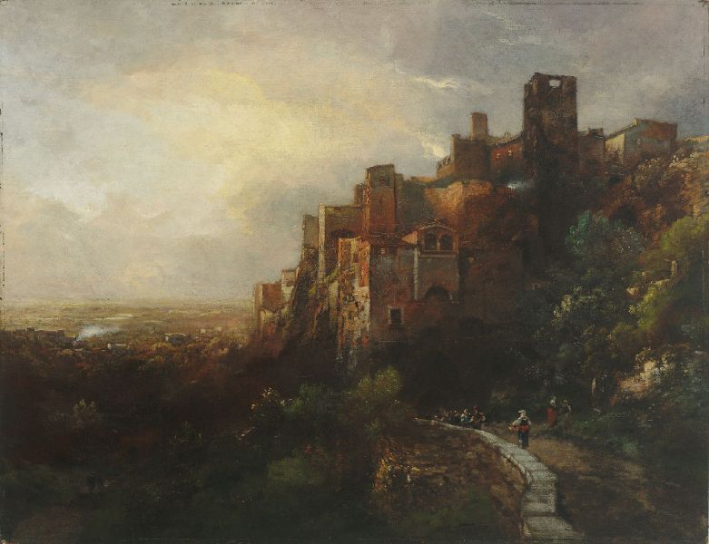 | Abendlich beleuchtete Stadt im Apennin mit weitem Blick in das Land. Figurenstaffage auf altem Weg. | |
