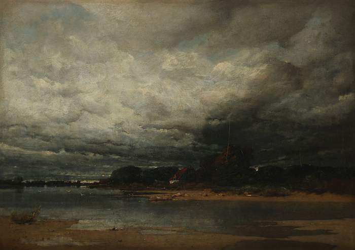 | Wolkenstimmung über weiter Landschaft am See mit Gehöft und Kirche | |