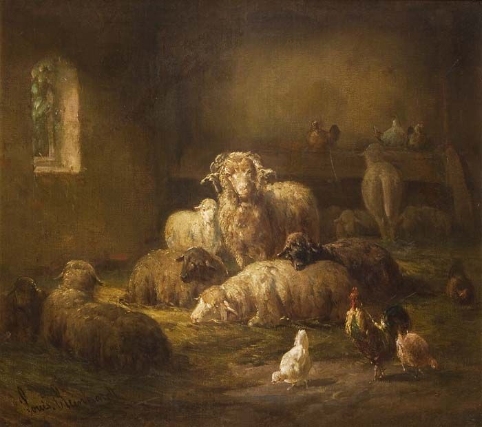Schafe und Federvieh im Stall-Interieur
