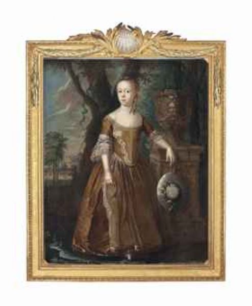 | Portrait of a girl, full-length, in a gold dress with lace trim, her left arm resting on a plinth, in a landscape | |