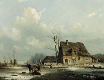 A horse-drawn-sledge on a frozen waterway