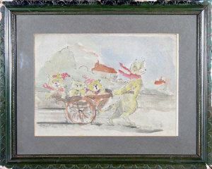 A humorous cartoon depicting a cat pulling three kittens in a handcart