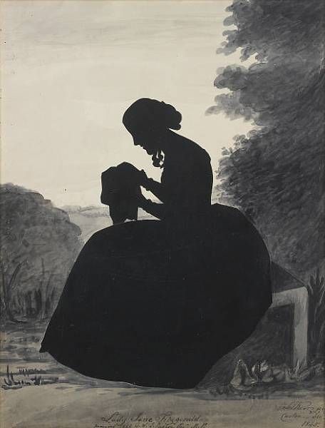 | A silhouette of Lady Jane Fitzgerald (1824-98), profile to the left, seated in a landscape doing needlework. | |
