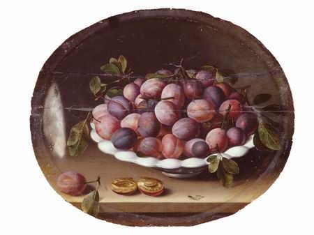 NATURE MORTE A LA COUPE DE PRUNES SUR UN ENTABLEMENT