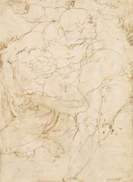 Three nude figures locked in a struggle