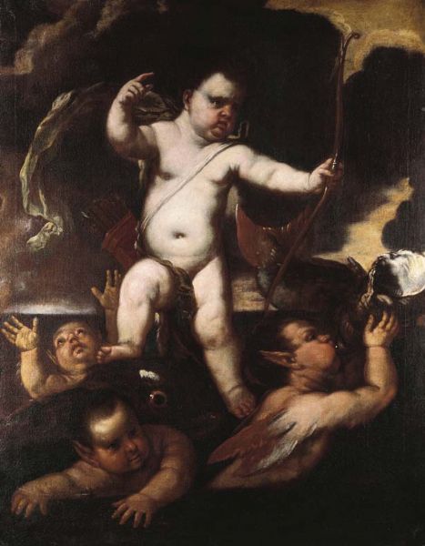 DER AMORKNABE, WUTENTBRANNT, AUF EINEM DELFIN