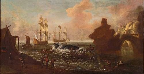A sea monster hunt with numerous figures off an imaginary Mediterranean coast