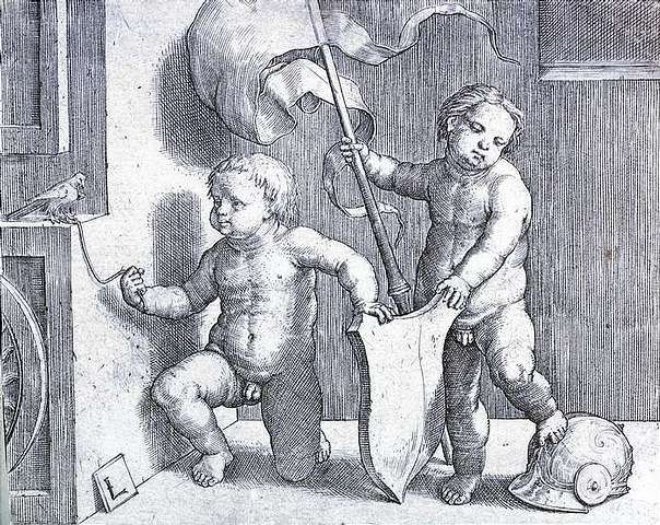 Zwei nackte Knaben mit einem weissen Wappenschild