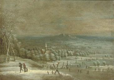 | An extensive winter landscape with travellers on a path and skaters on a frozen lake | |