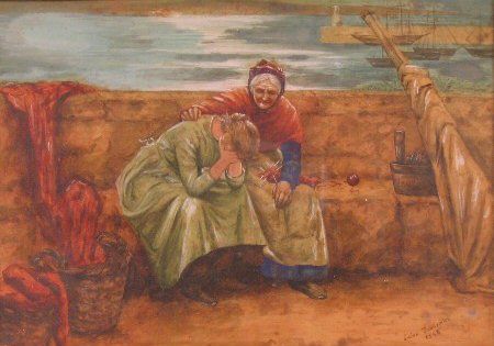grieving fisher woman sat on a harbour wall