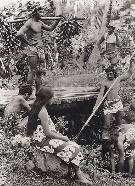 | TAHITIENNE A LA PALME, JEUNE TAHITIEN, TE FARE, GROUPE DE TAHITIENS, MARQUISIEN EN COSTUME DE CHEVEUX HUMAINS SUR LES PIERRES SA | |