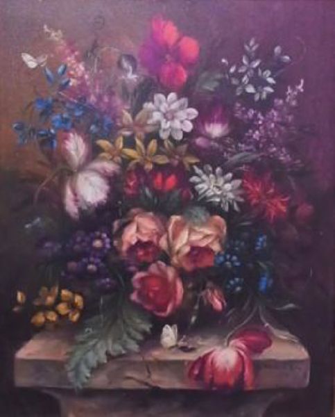 Still life with Summer flowers on a stone pillar with butterflies