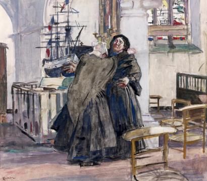 Deux bretonnes près de l'ex-voto dans la chapelle
