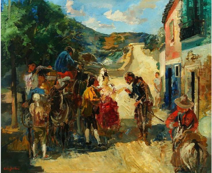Don Quizote møder fornemme rejsende uden for en kro