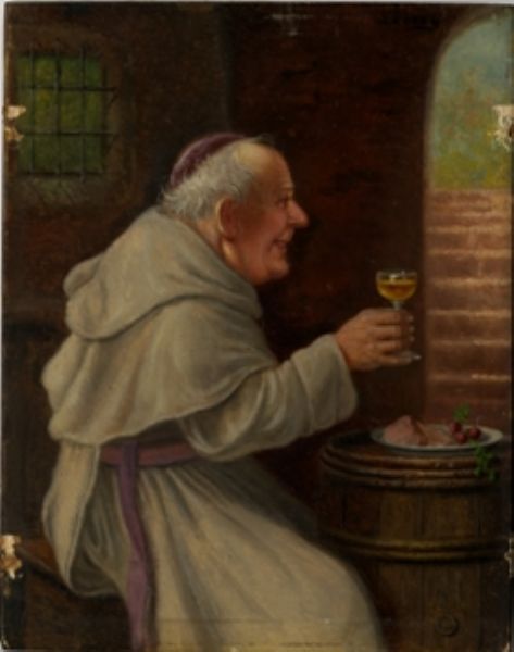 Mnich s číší vína a talířem uzeného