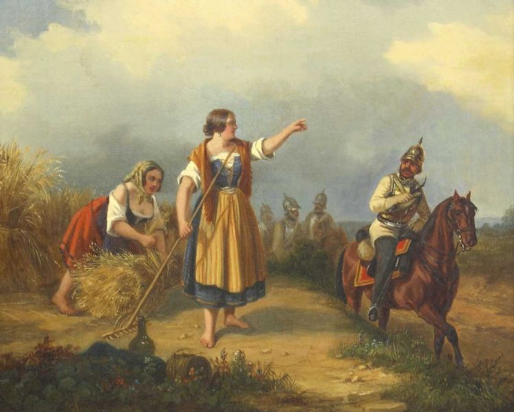 | Landmädchen bei der Kornernte von einem vorbeiziehenden preussischen Kavalleristen in der Arbeit unterbrochen | |