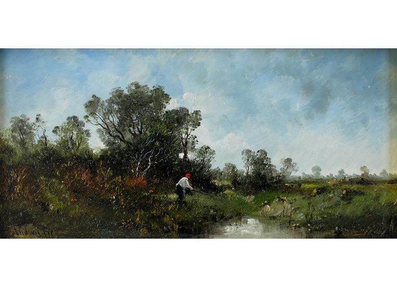 AUENLANDSCHAFT MIT FISCHER AN EINEM GEWÄSSER