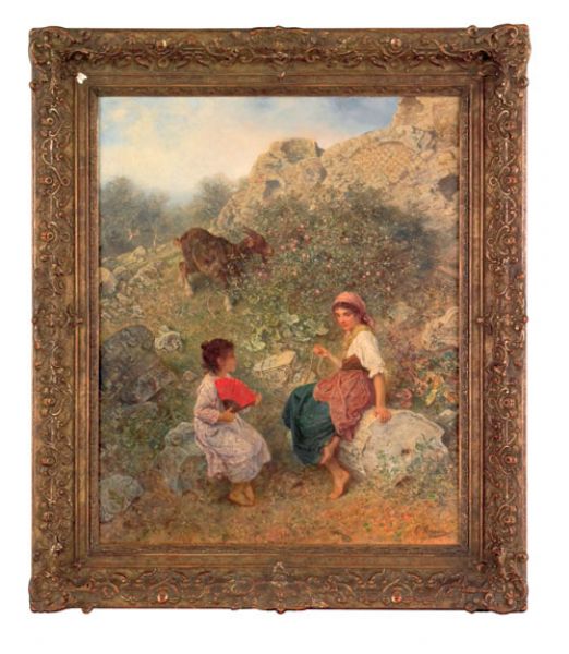 Landscape with two young women tending a goat