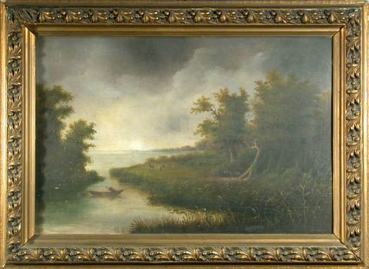 | Morgendliche Stimmung an einem von Gewitterwolken überschatteten See. Im Vordergrund ein Jäger in seinem Nachen vor dem waldigen | |