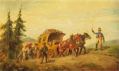 Postkutsche mit Kutscher auf steilem Hügel, bergauf fahrend