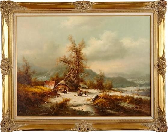 FAMILY OUTSIDE AN ALPINE THATCHED COTTAGE, WINTER