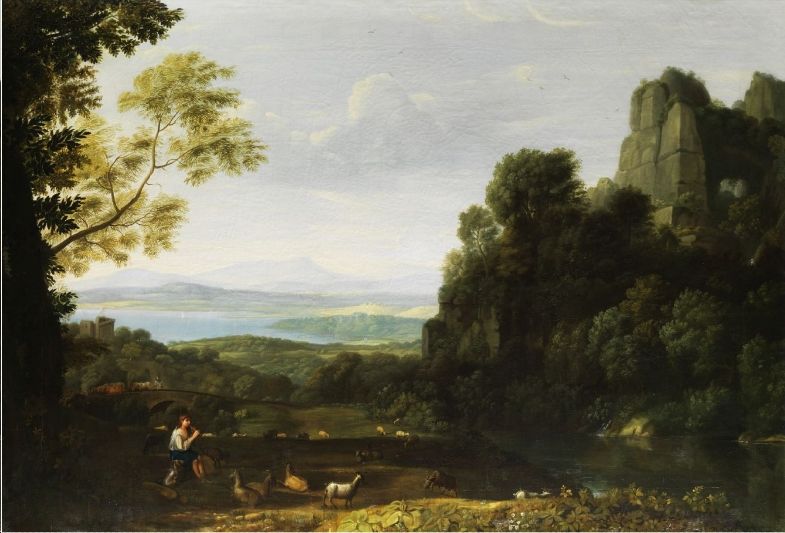 IDEALE FLUSSLANDSCHAFT MIT BRÜCKE UND SCHALMEIBLASENDEM HIRTEN