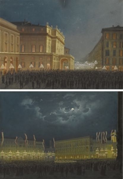Vedute notturne di Piazza della Scala e Piazza del Duomo, Milano
