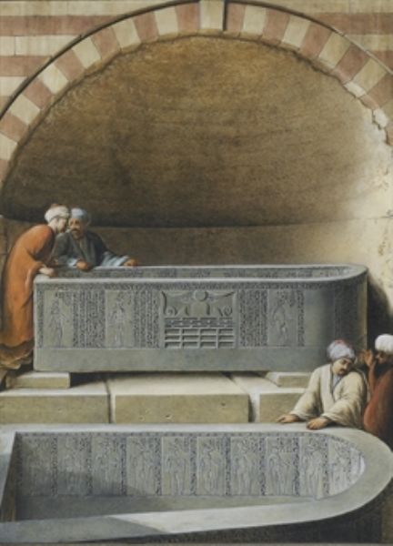 Figures in a tomb examining basalt sarcophogae, Cairo