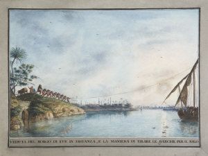 VEDUTA DEL BORGO DI FUE IN DISTANZA, E LA MANIERA DI TIRARE LE BARCHE PER IL NILO