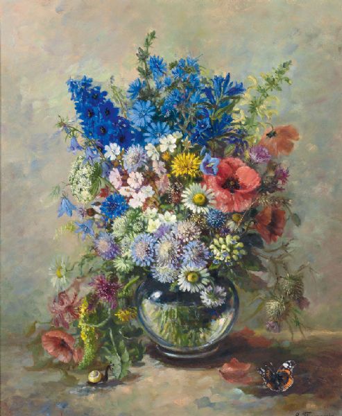 Bunter Sommerblumenstrauß mit Insekten und Schnecke