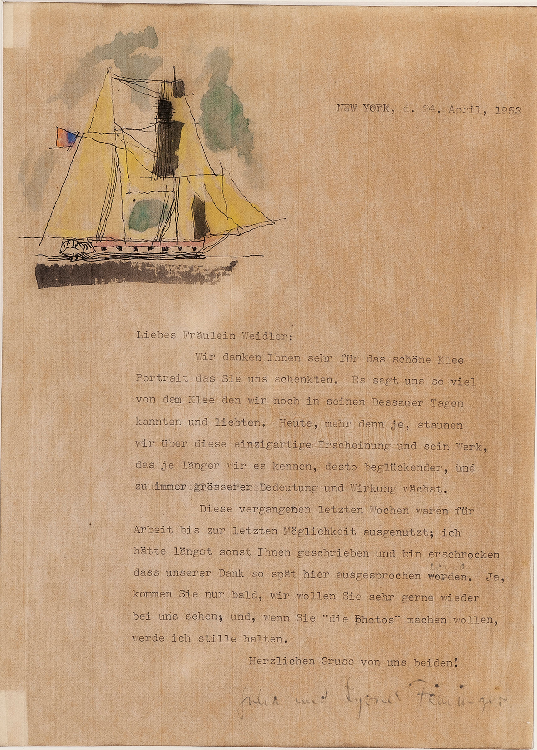 | Typewritten artist's letter with watercolour, depicting a schooner | |