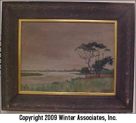 impressionistic landscape with boats on water and stand of trees on right