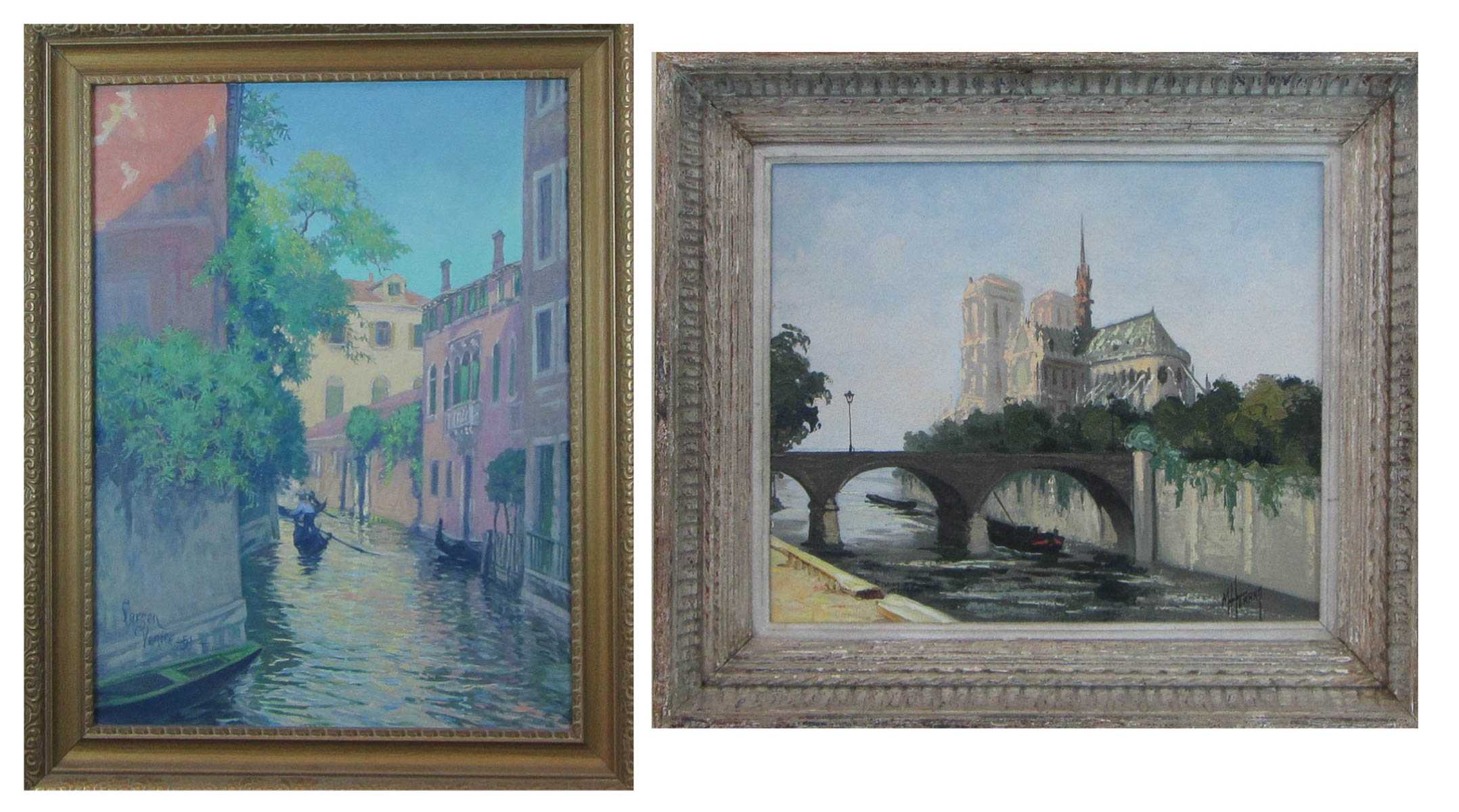Benjamin Daniel Larsen (Oregon, 1892-1970) oil on board, "Venice," signed lower left and dated 1951, image measures 24" x 18". In wood frames. | |