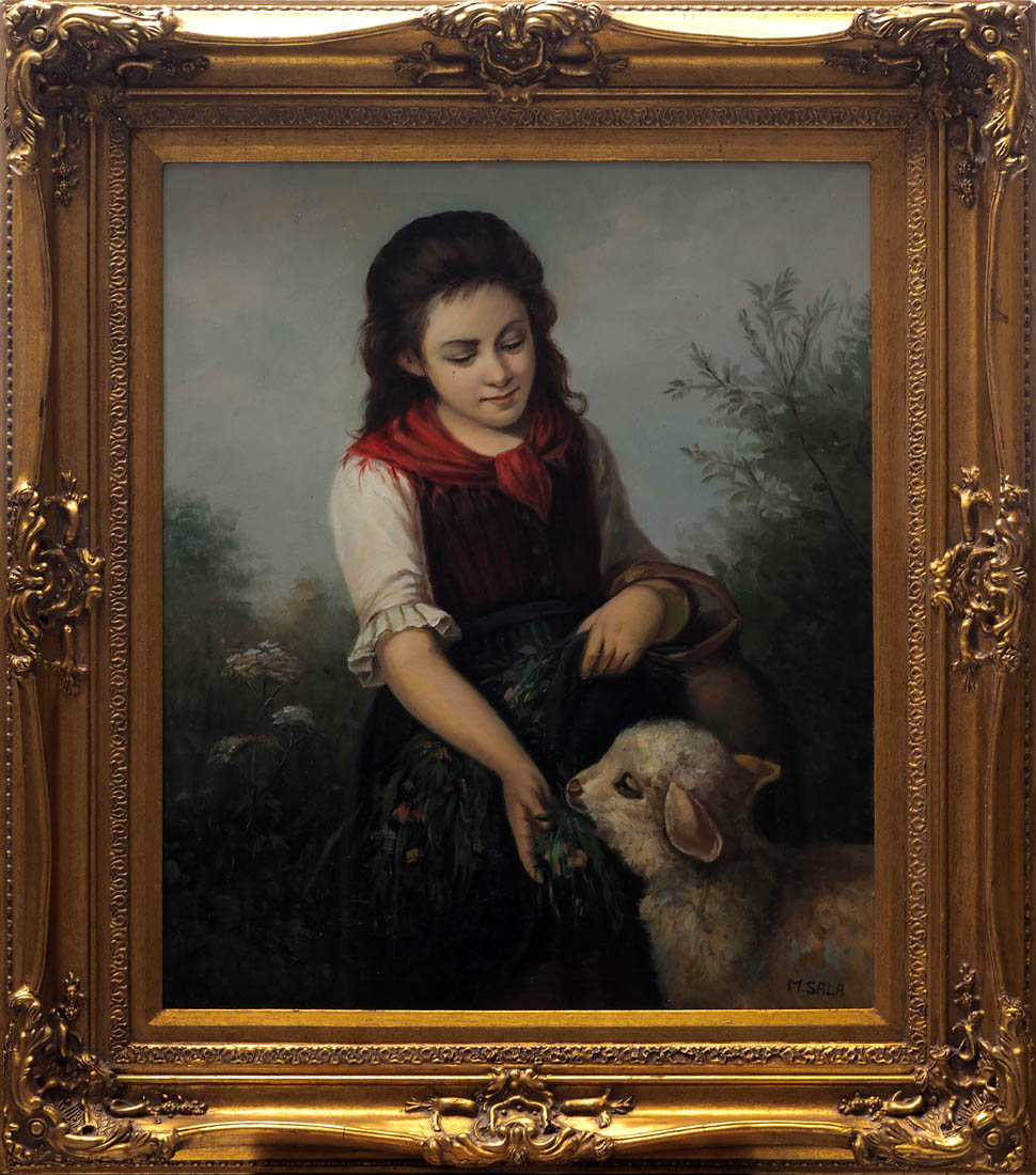 | Little girl in traditional dress, feeding a lamb with meadow flowers | |