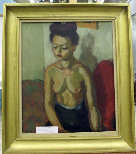 Porträtt av kvinna med uppsatt hår, bar överkropp