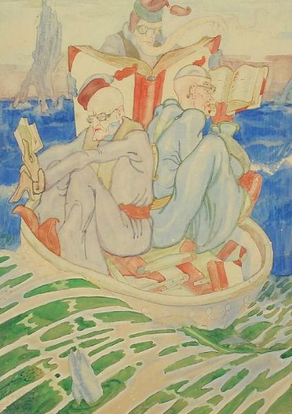 Satirical composition with readers in a life boat.