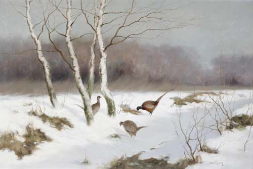 Fasane in winterlicher Moorlandschaft