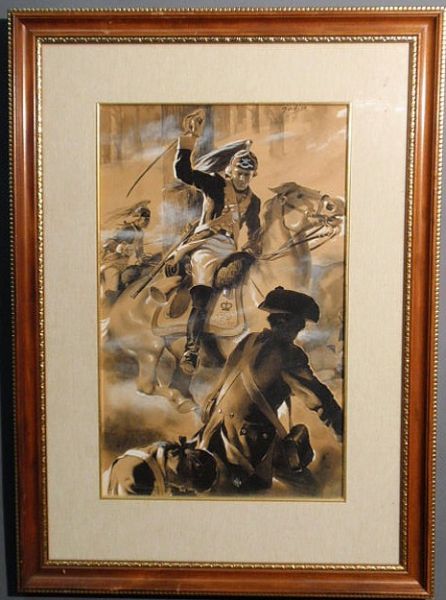 Revolutionary War scene with British dragoons and Continental army soldiers