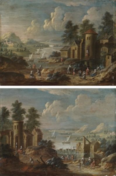 | A river landscape with a tower and a watermill; and A river landscape with a village | |