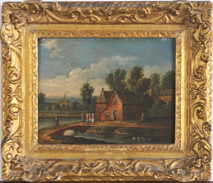 FIGURES NEAR COTTAGES IN RIVER LANDSCAPES