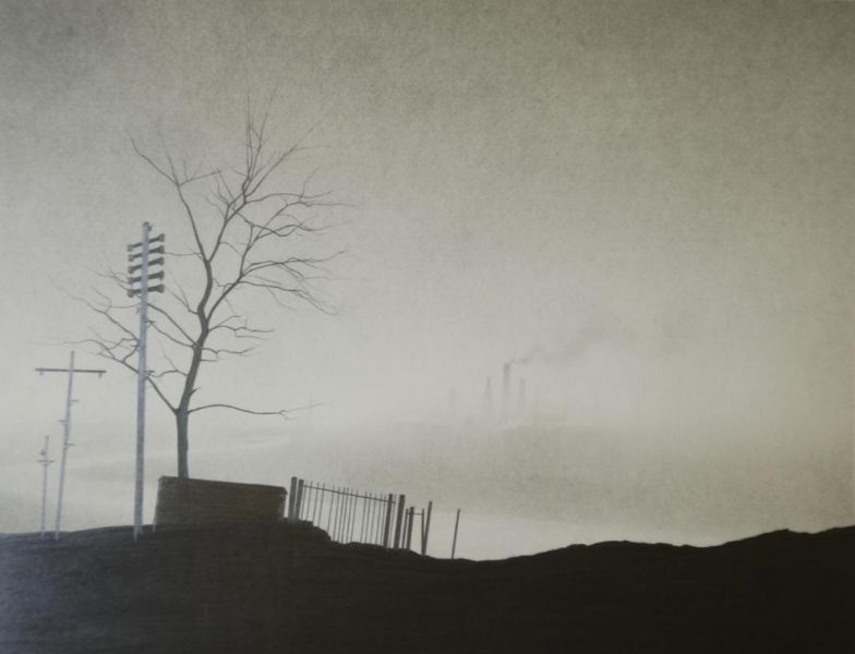 | Industrial landscape with tree, railing and telegraph poles in foreground | |