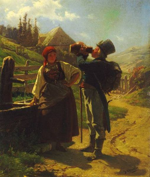 | Durstiger Wanderer am Brunnen neben junger Frau in Tracht. Reizendes Genre | |